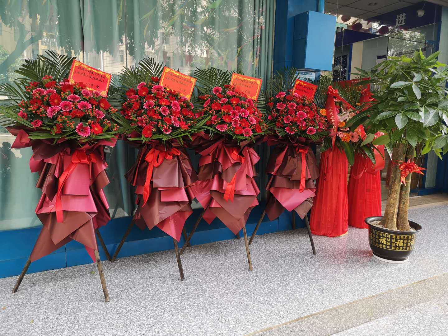 门口摆了很多的花篮。